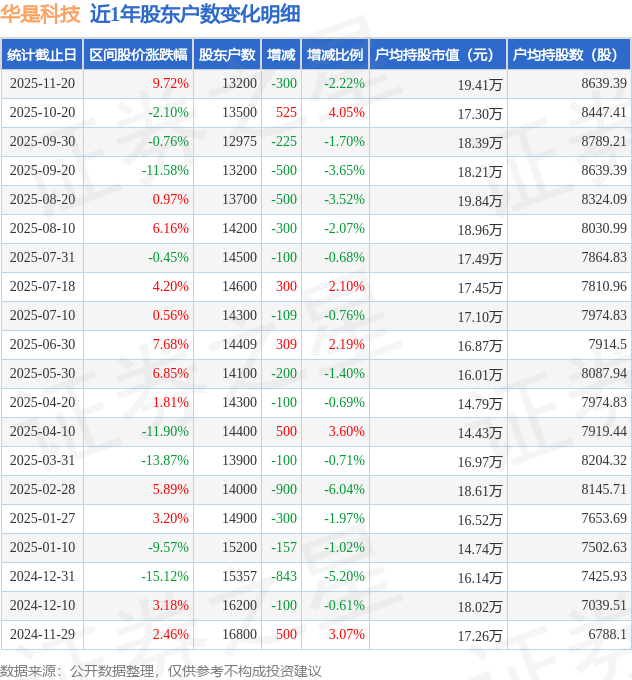 从股价来看,2025年10月20日至2025年11月20日,华是科技区间涨幅为9.72%,在此期间股东户数减少300.0户,减幅为2.22%。
