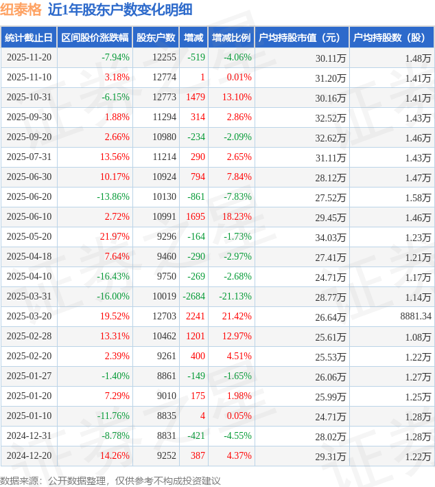 从股价来看,2025年11月10日至2025年11月20日,纽泰格区间跌幅为7.94%,在此期间股东户数减少519.0户,减幅为4.06%。