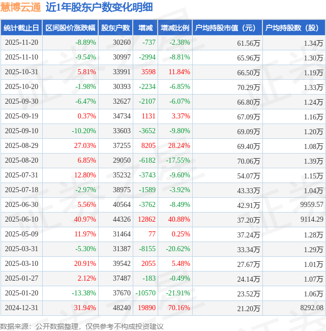 从股价来看,2025年11月10日至2025年11月20日,慧博云通区间跌幅为8.89%,在此期间股东户数减少737.0户,减幅为2.38%。