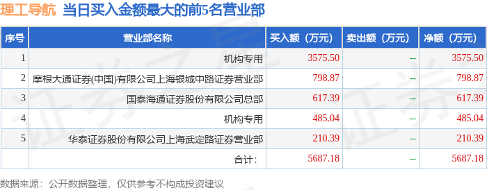 证券之星消息,沪深交易所2025年11月28日公布的交易公开信息显示,理工导航(688282)因有价格涨跌幅限制的日收盘价格涨幅达到15%的前五只证券登上龙虎榜。此次是近5个交易日内第1次上榜。