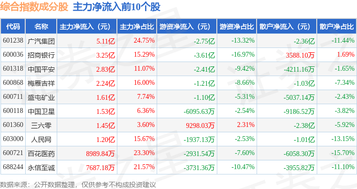 资金流向方面,综合指数(000008)成份股当日主力资金净流入合计1.02亿元,游资资金净流出合计3.89亿元,散户资金净流入合计2.87亿元。成份股资金流向详情见下表:
