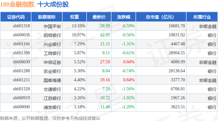 证券之星消息,11月28日,180金融(000018)指数报收于5790.15点,跌0.54%,成交335.55亿元,换手率0.24%。当日该指数成份股中,上涨的有14家,沪农商行以2.95%的涨幅领涨,下跌的有25家,邮储银行以1.9%的跌幅领跌。