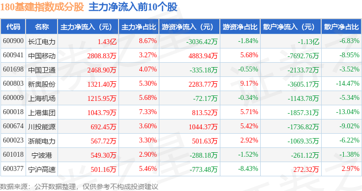 资金流向方面,180基建(000025)指数成份股当日主力资金净流出合计3.66亿元,游资资金净流入合计4.5亿元,散户资金净流出合计8396.22万元。成份股资金流向详情见下表: