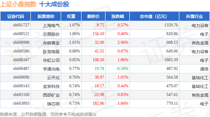 证券之星消息,11月28日,上证小盘(000045)指数报收于5496.34点,涨1.1%,成交1383.1亿元,换手率1.25%。当日该指数成份股中,上涨的有244家,晶合集成以10.42%的涨幅领涨,下跌的有67家,源杰科技以2.55%的跌幅领跌。