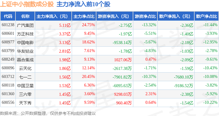 资金流向方面,上证中小(000046)指数成份股当日主力资金净流入合计11.79亿元,游资资金净流出合计9.11亿元,散户资金净流出合计2.68亿元。成份股资金流向详情见下表: