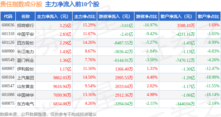资金流向方面,责任指数(000048)成份股当日主力资金净流入合计1.99亿元,游资资金净流入合计2.07亿元,散户资金净流出合计4.06亿元。成份股资金流向详情见下表: