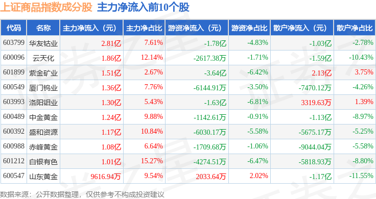 资金流向方面,上证商品(000066)指数成份股当日主力资金净流入合计13.29亿元,游资资金净流出合计5.68亿元,散户资金净流出合计7.61亿元。成份股资金流向详情见下表: