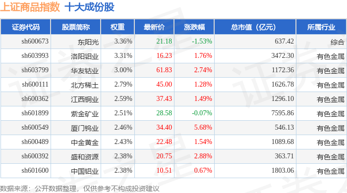 证券之星消息,11月28日,上证商品(000066)指数报收于3312.11点,涨0.77%,成交402.86亿元,换手率0.49%。当日该指数成份股中,上涨的有33家,厦门钨业以5.68%的涨幅领涨,下跌的有15家,合盛硅业以1.68%的跌幅领跌。