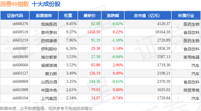 消费80(000069)指数十大成份股详情如下:
