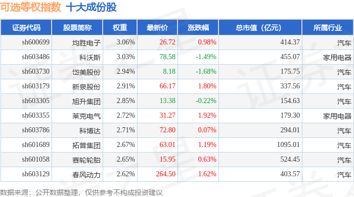 证券之星消息,11月28日,可选等权(000073)指数报收于3401.25点,涨0.86%,成交210.79亿元,换手率0.98%。当日该指数成份股中,上涨的有37家,广汽集团以9.99%的涨幅领涨,下跌的有12家,岱美股份以1.68%的跌幅领跌。