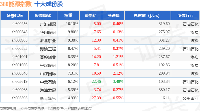 证券之星消息,11月28日,380能源(000104)指数报收于1286.8点,涨0.31%,成交19.64亿元,换手率0.59%。当日该指数成份股中,上涨的有11家,山煤国际以2.12%的涨幅领涨,下跌的有1家,中曼石油以3.48%的跌幅领跌。