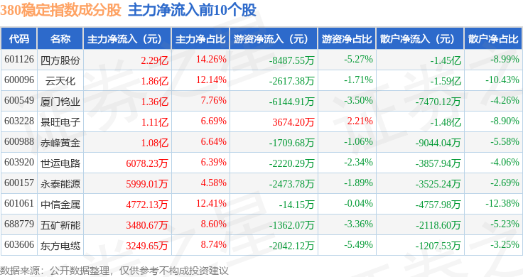 资金流向方面,380稳定(000142)指数成份股当日主力资金净流入合计9424.04万元,游资资金净流入合计1.98亿元,散户资金净流出合计2.92亿元。成份股资金流向详情见下表: