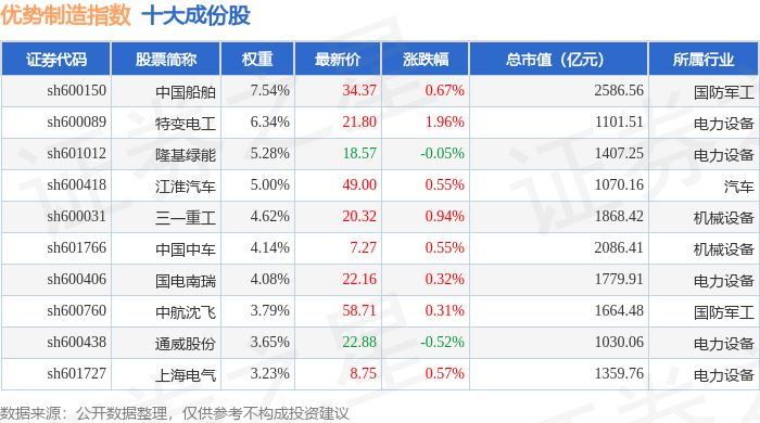 证券之星消息,11月28日,优势制造(000146)指数报收于7450.76点,涨1.0%,成交389.05亿元,换手率1.02%。当日该指数成份股中,上涨的有42家,金盘科技以8.86%的涨幅领涨,下跌的有6家,华丰科技以0.72%的跌幅领跌。