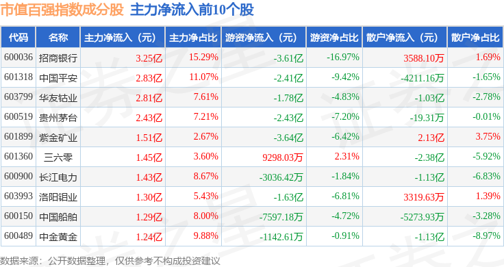 资金流向方面,市值百强(000155)指数成份股当日主力资金净流出合计8.42亿元,游资资金净流出合计3.13亿元,散户资金净流入合计11.55亿元。成份股资金流向详情见下表: