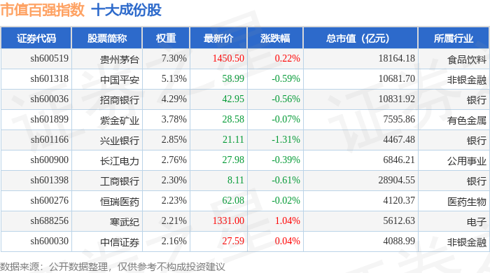 市值百强(000155)指数十大成份股详情如下:
