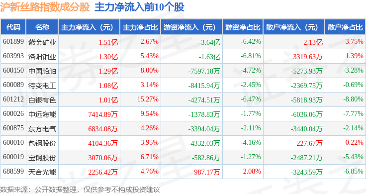 资金流向方面,沪新丝路(000160)指数成份股当日主力资金净流出合计1.94亿元,游资资金净流出合计3.56亿元,散户资金净流入合计5.5亿元。成份股资金流向详情见下表: