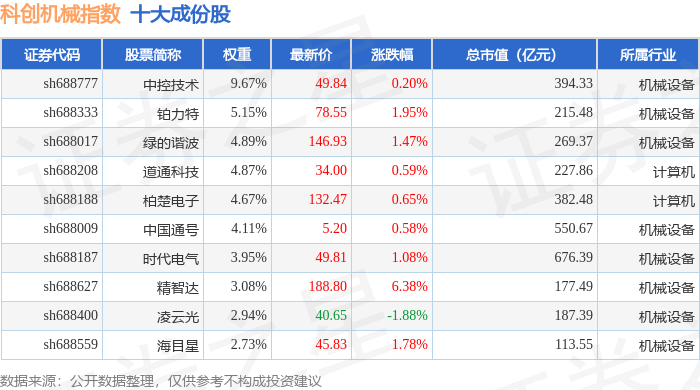 证券之星消息,11月28日,科创机械(000693)指数报收于1307.33点,涨1.2%,成交92.23亿元,换手率0.77%。当日该指数成份股中,上涨的有40家,步科股份以12.35%的涨幅领涨,下跌的有9家,浙海德曼以1.89%的跌幅领跌。