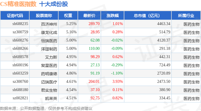 证券之星消息,11月28日,CS精准医(000863)指数报收于2754.58点,涨0.6%,成交123.83亿元,换手率0.83%。当日该指数成份股中,上涨的有26家,迈瑞医疗以3.93%的涨幅领涨,下跌的有11家,药明康德以1.1%的跌幅领跌。