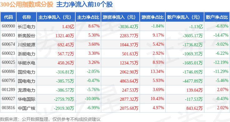 资金流向方面,300公用(000917)指数成份股当日主力资金净流出合计3850.16万元,游资资金净流入合计2.16亿元,散户资金净流出合计1.78亿元。成份股资金流向详情见下表: