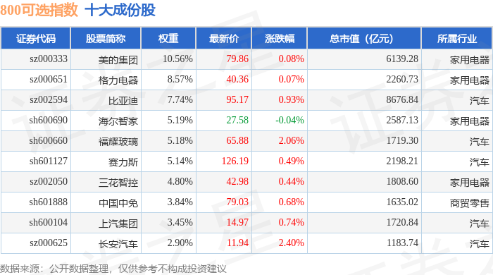 800可选(000931)指数十大成份股详情如下: