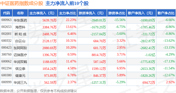 资金流向方面,中证医药(000933)指数成份股当日主力资金净流出合计10.08亿元,游资资金净流入合计3.82亿元,散户资金净流入合计6.26亿元。成份股资金流向详情见下表: