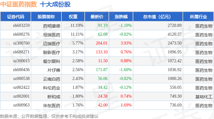 证券之星消息,11月28日,中证医药(000933)指数报收于8394.36点,涨0.23%,成交224.05亿元,换手率0.65%。当日该指数成份股中,上涨的有39家,海思科以4.43%的涨幅领涨,下跌的有38家,以岭药业以2.4%的跌幅领跌。
