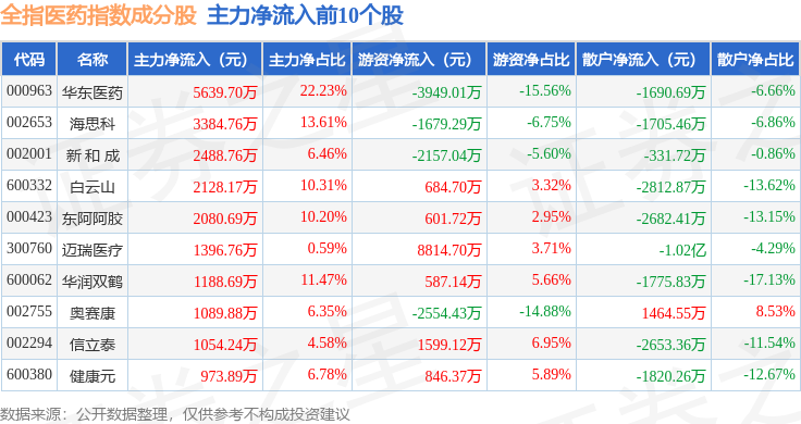 资金流向方面,全指医药(000991)指数成份股当日主力资金净流出合计11.61亿元,游资资金净流入合计5.22亿元,散户资金净流入合计6.4亿元。成份股资金流向详情见下表: