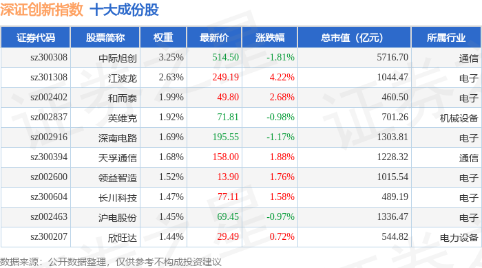 证券之星消息,11月28日,深证创新(399016)指数报收于5454.15点,涨1.17%,成交1220.84亿元,换手率1.77%。当日该指数成份股中,上涨的有81家,长盈精密以11.19%的涨幅领涨,下跌的有18家,中际旭创以1.81%的跌幅领跌。