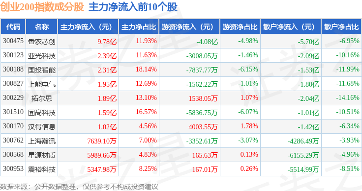 资金流向方面,创业200(399019)指数成份股当日主力资金净流出合计3.5亿元,游资资金净流出合计4.27亿元,散户资金净流入合计7.77亿元。成份股资金流向详情见下表: