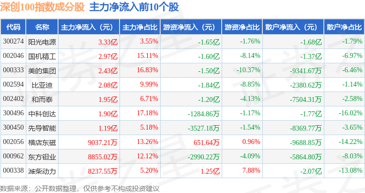 资金流向方面,深创100(399088)指数成份股当日主力资金净流出合计8.13亿元,游资资金净流入合计3.06亿元,散户资金净流入合计5.07亿元。成份股资金流向详情见下表: