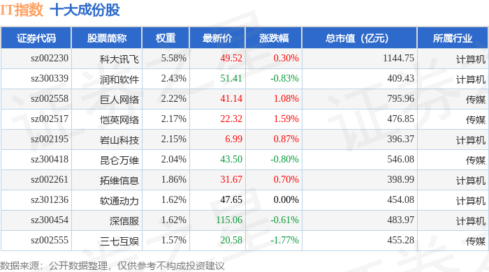 资金流向方面,IT指数(399239)成份股当日主力资金净流出合计10.2亿元,游资资金净流出合计5551.79万元,散户资金净流入合计10.76亿元。成份股资金流向详情见下表: