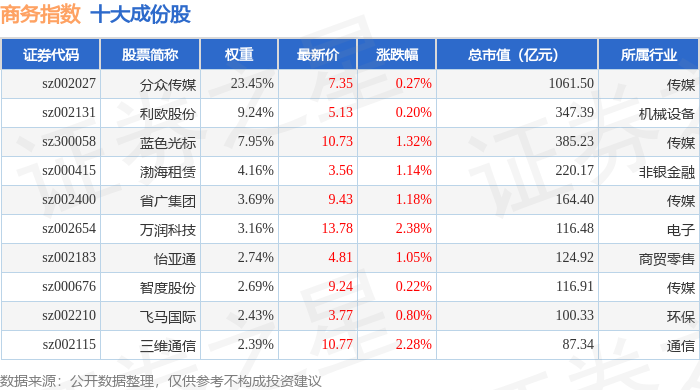 商务指数(399242)十大成份股详情如下: