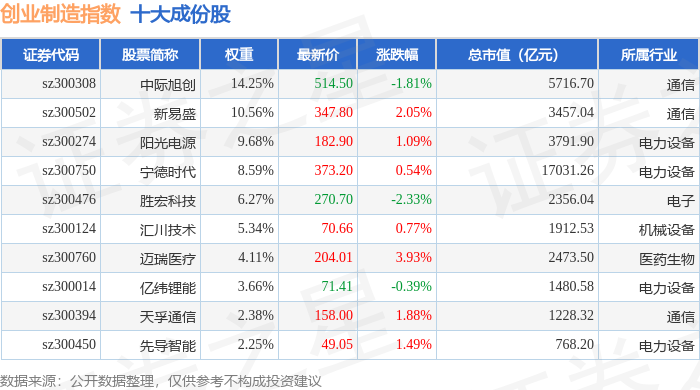 创业制造(399261)指数十大成份股详情如下: