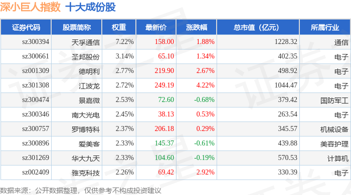 深小巨人(399268)指数十大成份股详情如下:
