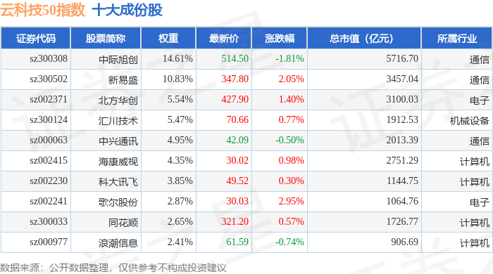 云科技50(399279)指数十大成份股详情如下:
