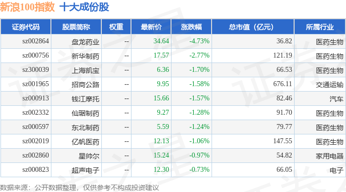 证券之星消息,11月28日,新浪100(399297)指数报收于5983.76点,涨0.91%,成交140.41亿元,换手率1.5%。当日该指数成份股中,上涨的有80家,合百集团以7.46%的涨幅领涨,下跌的有18家,盘龙药业以4.73%的跌幅领跌。