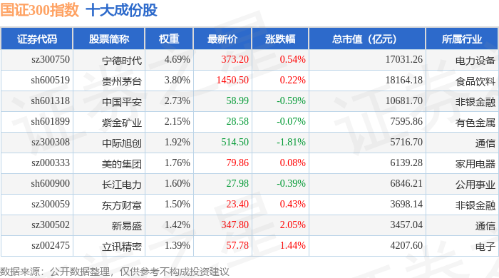国证300(399312)指数十大成份股详情如下: