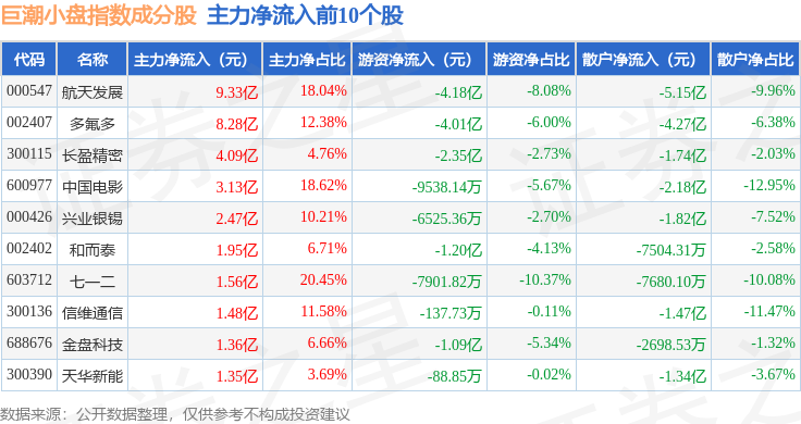 资金流向方面,巨潮小盘(399316)指数成份股当日主力资金净流入合计32.41亿元,游资资金净流出合计21.99亿元,散户资金净流出合计10.53亿元。成份股资金流向详情见下表: