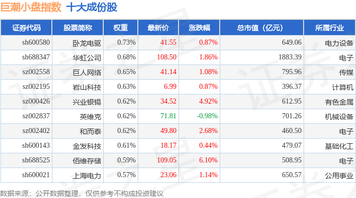 证券之星消息,11月28日,巨潮小盘(399316)指数报收于5725.87点,涨1.27%,成交2132.98亿元,换手率1.44%。当日该指数成份股中,上涨的有388家,宏达电子以14.31%的涨幅领涨,下跌的有97家,完美世界以6.59%的跌幅领跌。