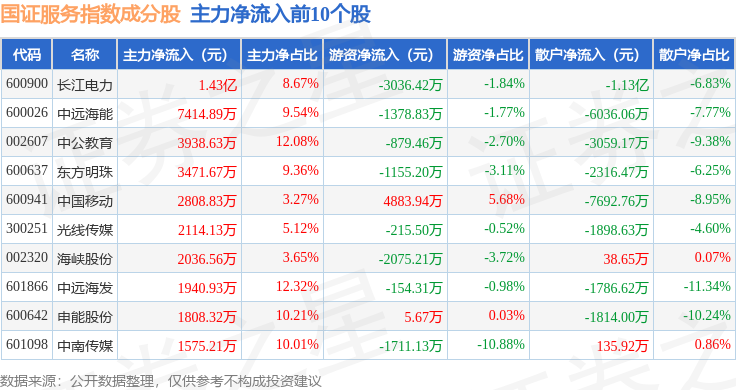资金流向方面,国证服务(399320)指数成份股当日主力资金净流出合计4.62亿元,游资资金净流入合计6.2亿元,散户资金净流出合计1.57亿元。成份股资金流向详情见下表:
