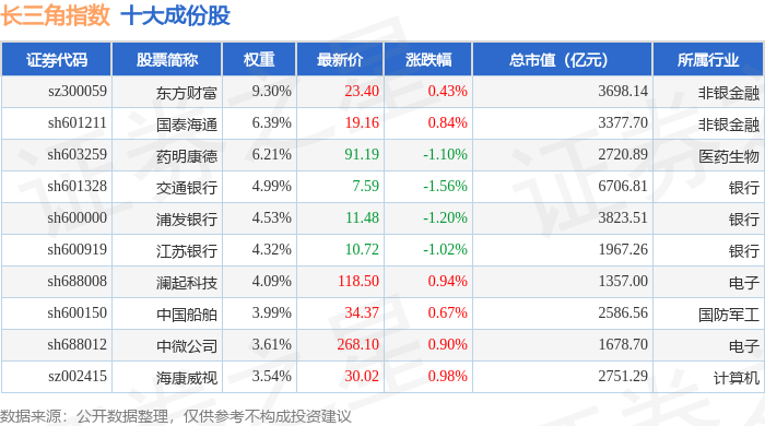 证券之星消息,11月28日,长三角(399355)指数报收于3573.78点,涨0.05%,成交438.39亿元,换手率0.46%。当日该指数成份股中,上涨的有26家,沪农商行以2.95%的涨幅领涨,下跌的有13家,合盛硅业以1.68%的跌幅领跌。