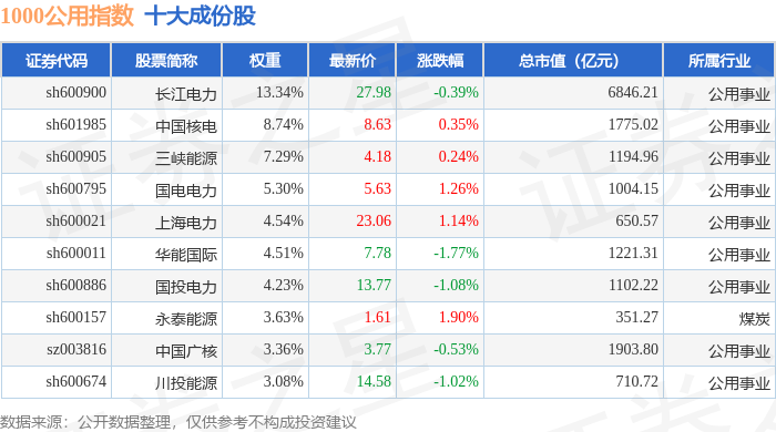 证券之星消息,11月28日,1000公用(399390)指数报收于2668.69点,涨0.08%,成交119.11亿元,换手率0.61%。当日该指数成份股中,上涨的有26家,九丰能源以2.45%的涨幅领涨,下跌的有16家,华能国际以1.77%的跌幅领跌。