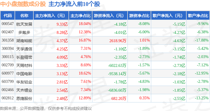 资金流向方面,中小盘(399401)指数成份股当日主力资金净流入合计55.41亿元,游资资金净流出合计32.91亿元,散户资金净流出合计22.6亿元。成份股资金流向详情见下表: