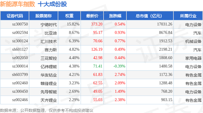 证券之星消息,11月28日,新能源车(399417)指数报收于3759.78点,涨1.43%,成交821.88亿元,换手率2.64%。当日该指数成份股中,上涨的有45家,湖南裕能以11.01%的涨幅领涨,下跌的有4家,麦格米特以0.99%的跌幅领跌。