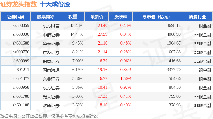 证券之星消息,11月28日,证券龙头(399437)指数报收于6601.66点,涨0.4%,成交148.5亿元,换手率0.53%。当日该指数成份股中,上涨的有24家,兴业证券以1.5%的涨幅领涨,下跌的有3家,首创证券以0.81%的跌幅领跌。
