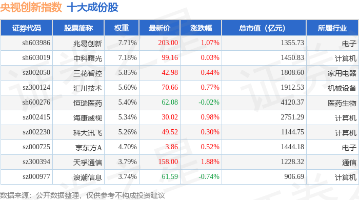 央视创新(399551)指数十大成份股详情如下: