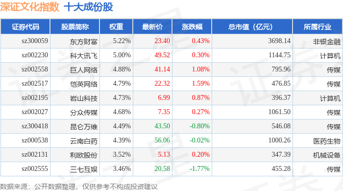 证券之星消息,11月28日,深证文化(399654)指数报收于2871.98点,涨0.24%,成交445.41亿元,换手率3.04%。当日该指数成份股中,上涨的有36家,中公教育以2.7%的涨幅领涨,下跌的有13家,完美世界以6.59%的跌幅领跌。