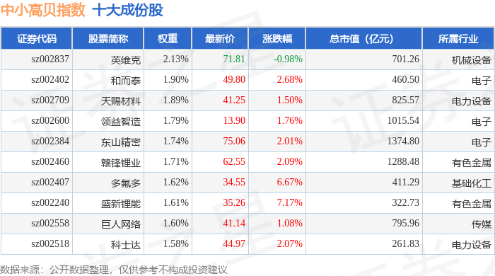 中小高贝(399664)指数十大成份股详情如下: