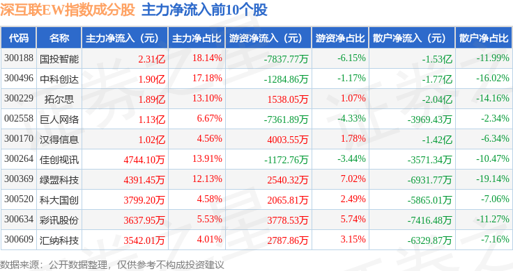 资金流向方面,深互联EW(399677)指数成份股当日主力资金净流出合计7.11亿元,游资资金净流入合计1.95亿元,散户资金净流入合计5.17亿元。成份股资金流向详情见下表: