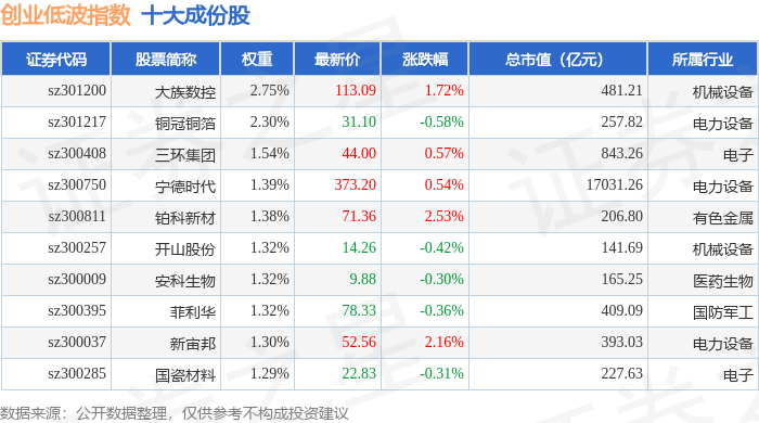 证券之星消息,11月28日,创业低波(399692)指数报收于3825.11点,涨0.74%,成交352.93亿元,换手率1.19%。当日该指数成份股中,上涨的有70家,华图山鼎以5.76%的涨幅领涨,下跌的有28家,华兰疫苗以6.6%的跌幅领跌。